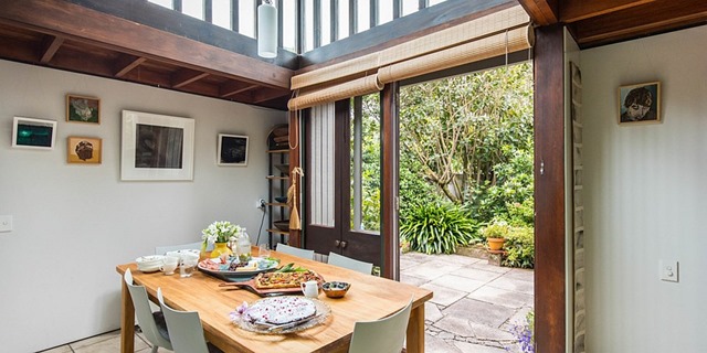 With several large additions at the front (large garage and a closed-in carport) that small home is now a large home, and the oiled cedar cladding has been painted over, but the small jewel Megson created is still to be found there behind it all, and in almost original form thanks to the current owners, Ruth and Duncan Ormond, who [ as the Herald explains] have done much to bring it back from the state in which they found it.